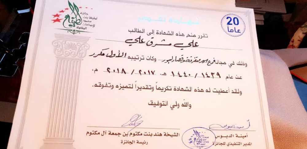 The family of Cedra Center for People of Determination in Ajman congratulates the outstanding student Ali Mashriq and his esteemed family on being honored with first place in memorizing short Qur’anic surahs in the Sheikha Hind bint Maktoum bin Juma Al Maktoum Award